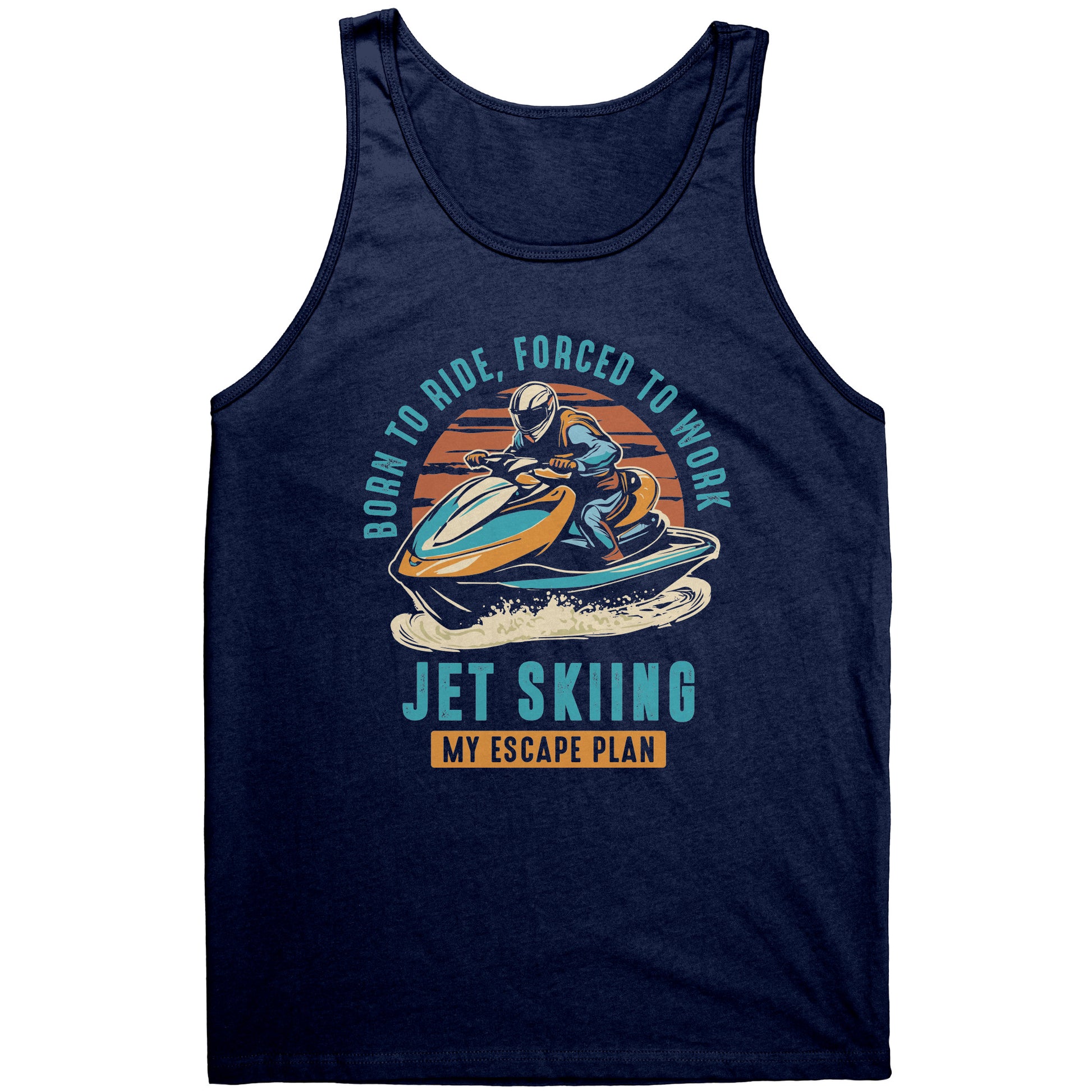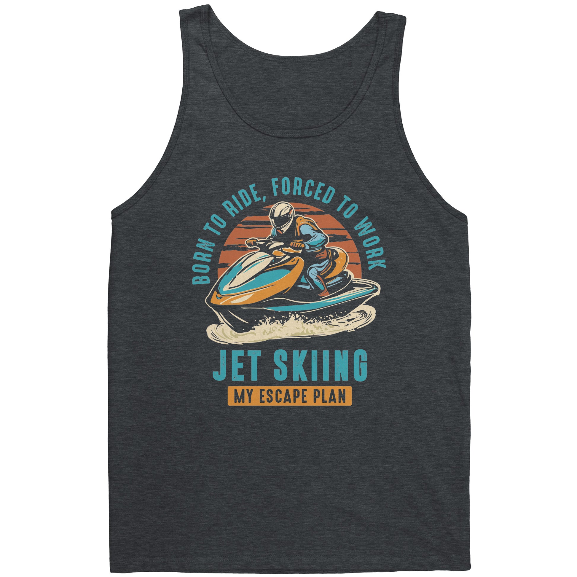Grab this hilarious "Born To Ride Forced To Work, Jet Skiing My Escape Plan" apparel crafted for any jet ski adventurer for those adventurous days out on the water. This jetski clothing tank top is your go-to gear for gliding through waves and experiencing the excitement of personal watercraft encounter.